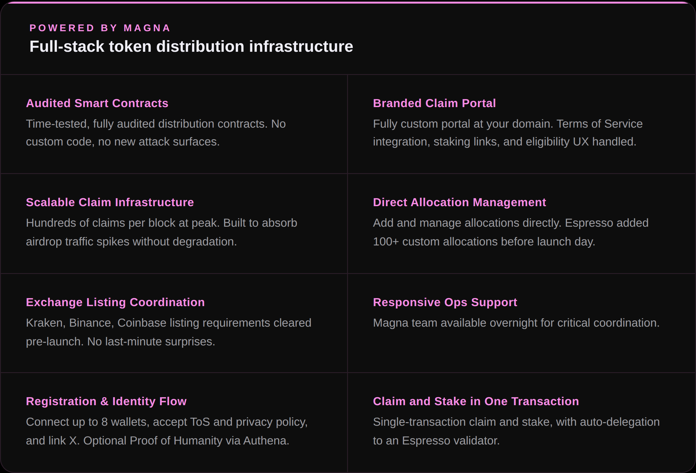 The Espresso Network is a base layer purpose-built to provide fast finality, high-throughput data availability, and (optionally) decentralized sequencing to chains that require speed, security, and a high degree of customizability without sacrificing sovereignty. . When the ESP token went live on February 12, 2026, they weren't thinking about claim portals or distribution contracts. That work was already done. Magna took care of everything, audited contracts, a branded claim portal, and infrastructure that absorbed 8.9 million submitted accounts without the team noticing.