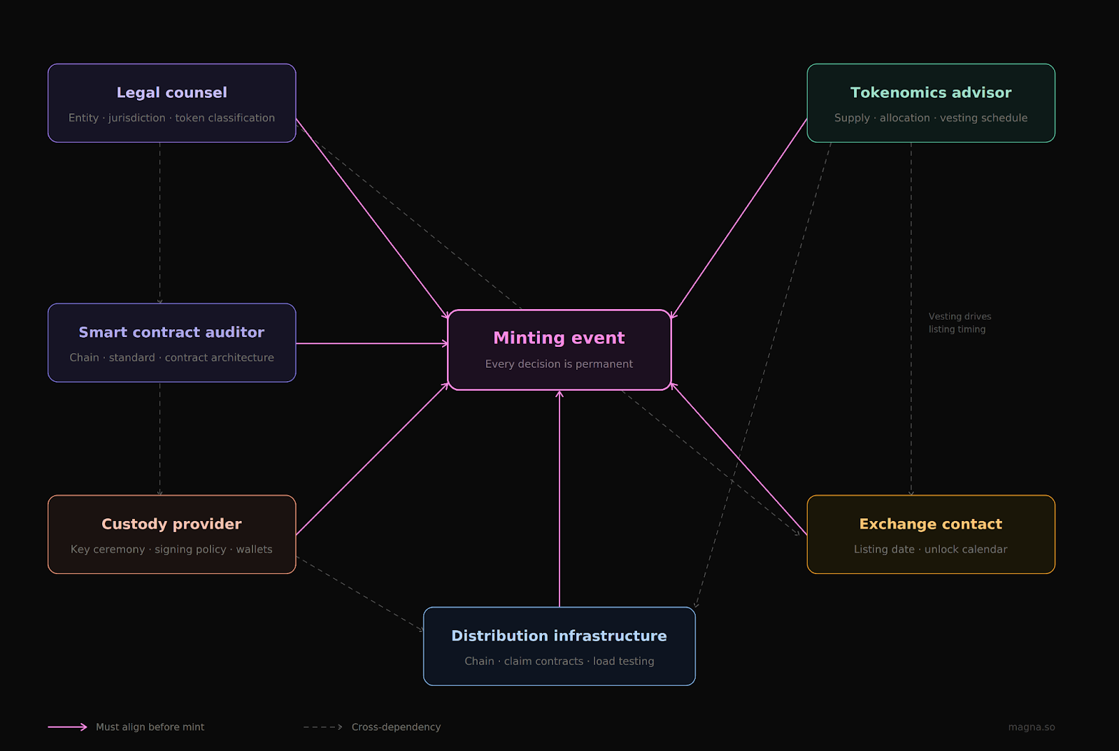 This post goes deeper on both. Specifically on what the minting moment requires from the people responsible for each one, because minting isn’t just a technical event. It’s the moment where legal structure, custody infrastructure, tokenomics design, and exchange strategy all need to have been aligned. If they haven’t, you find out on the day. And that’s the worst possible time to find out.